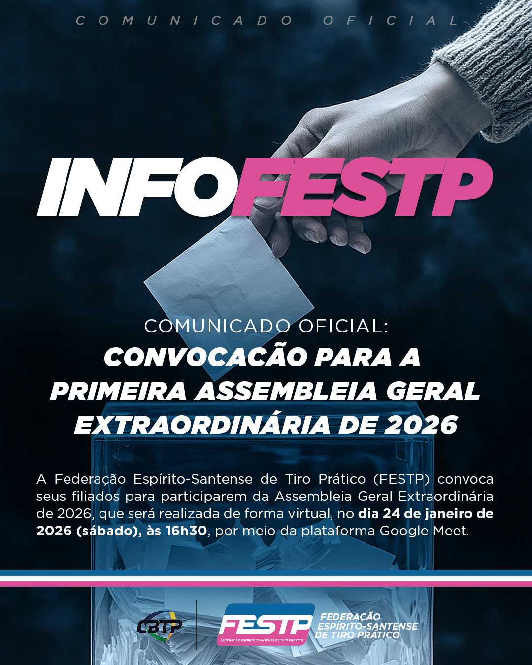 A Federação Espírito-Santense de Tiro Prático (FESTP) convoca oficialmente todos os seus filiados, associações e clubes regularmente quites com suas obrigações estatutárias para participarem da Assembleia Geral Extraordinária (AGE), que será realizada de forma virtual, conforme previsto em Estatuto.